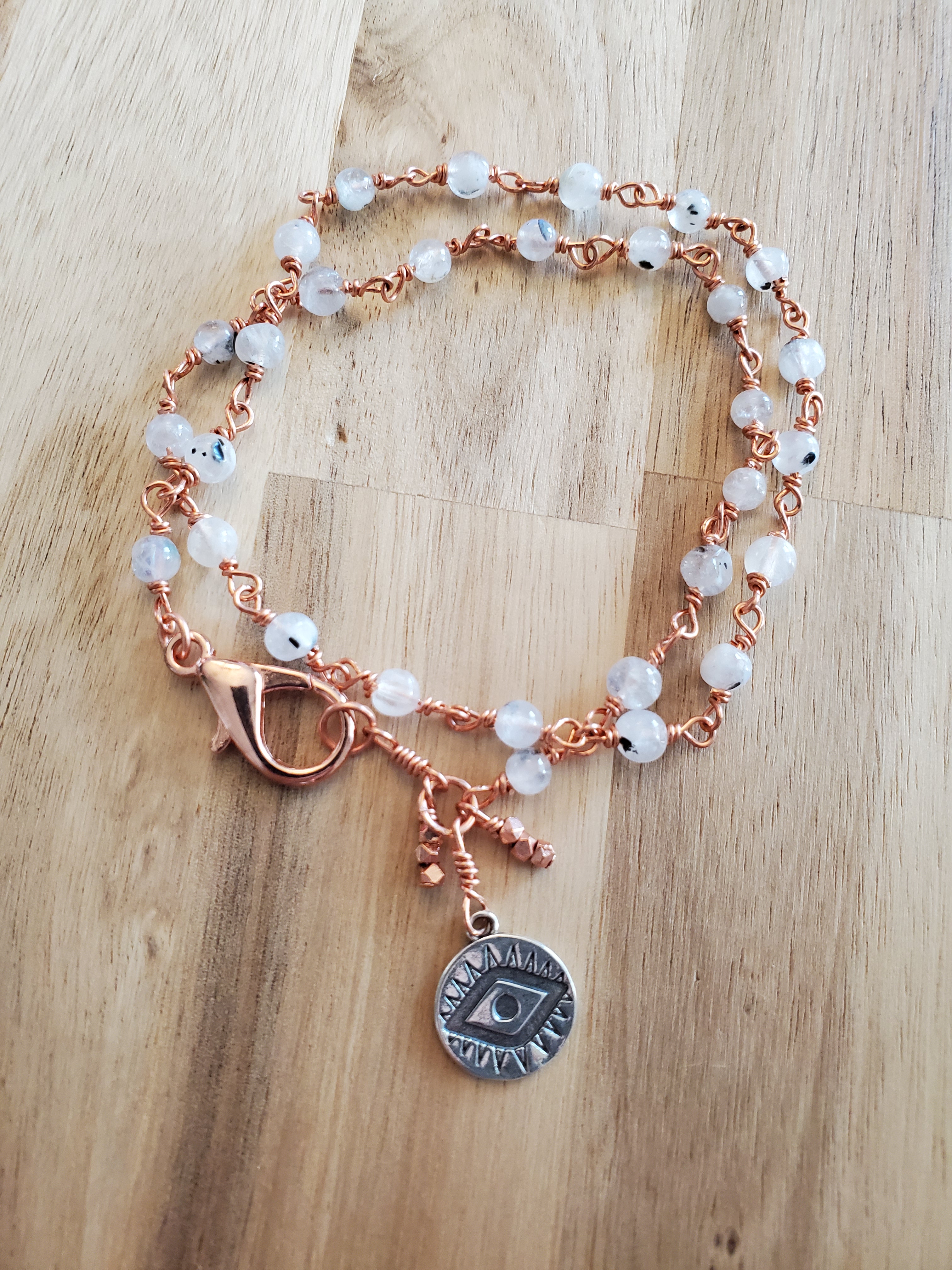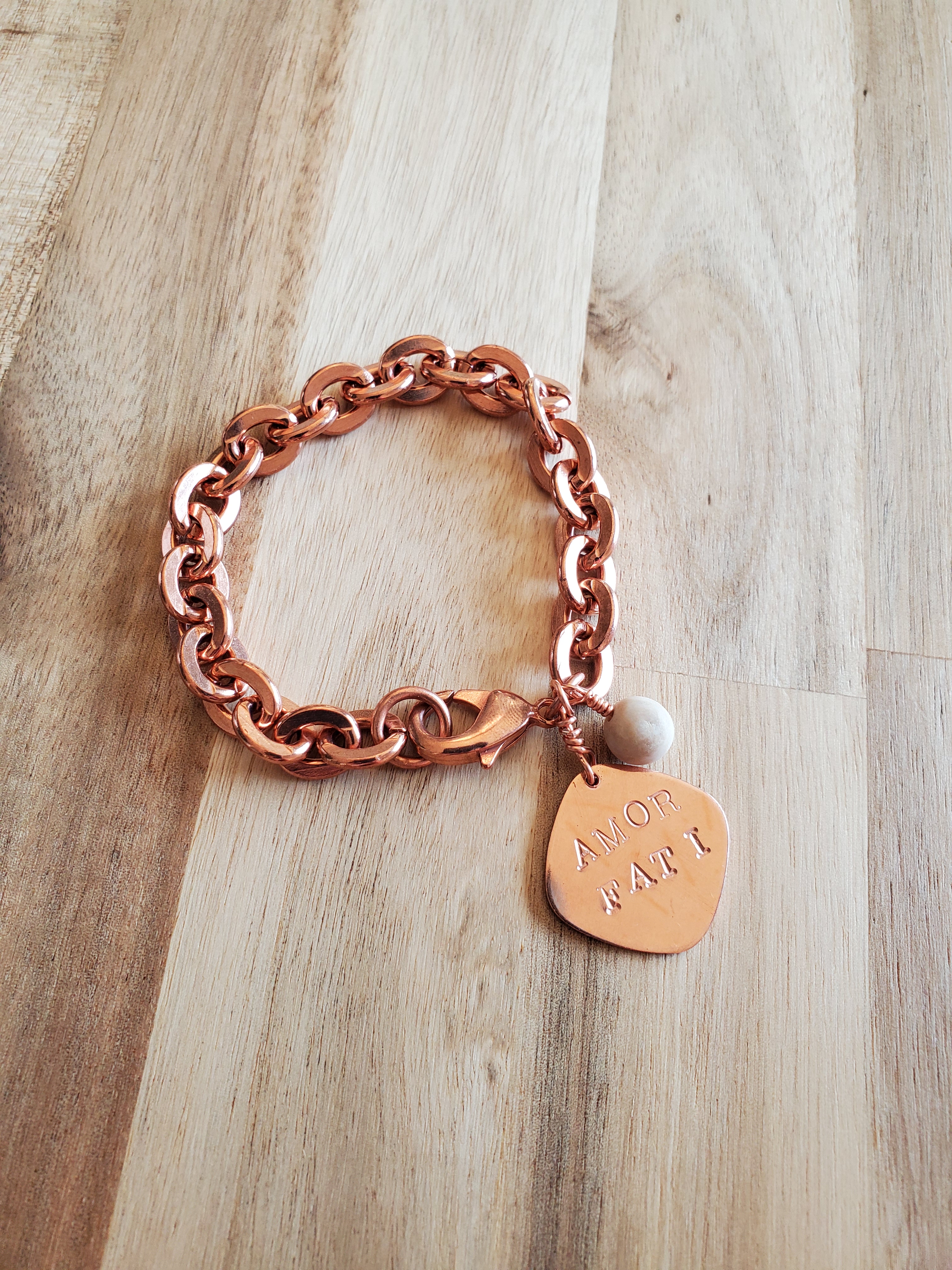 All my wire, stamping tags, and the majority of my findings are made from pure copper. I use raw, unsealed copper for maximum physical and metaphysical benefits. Copper will patina naturally with wear, but may be polished with a jewelry cloth, if desired.