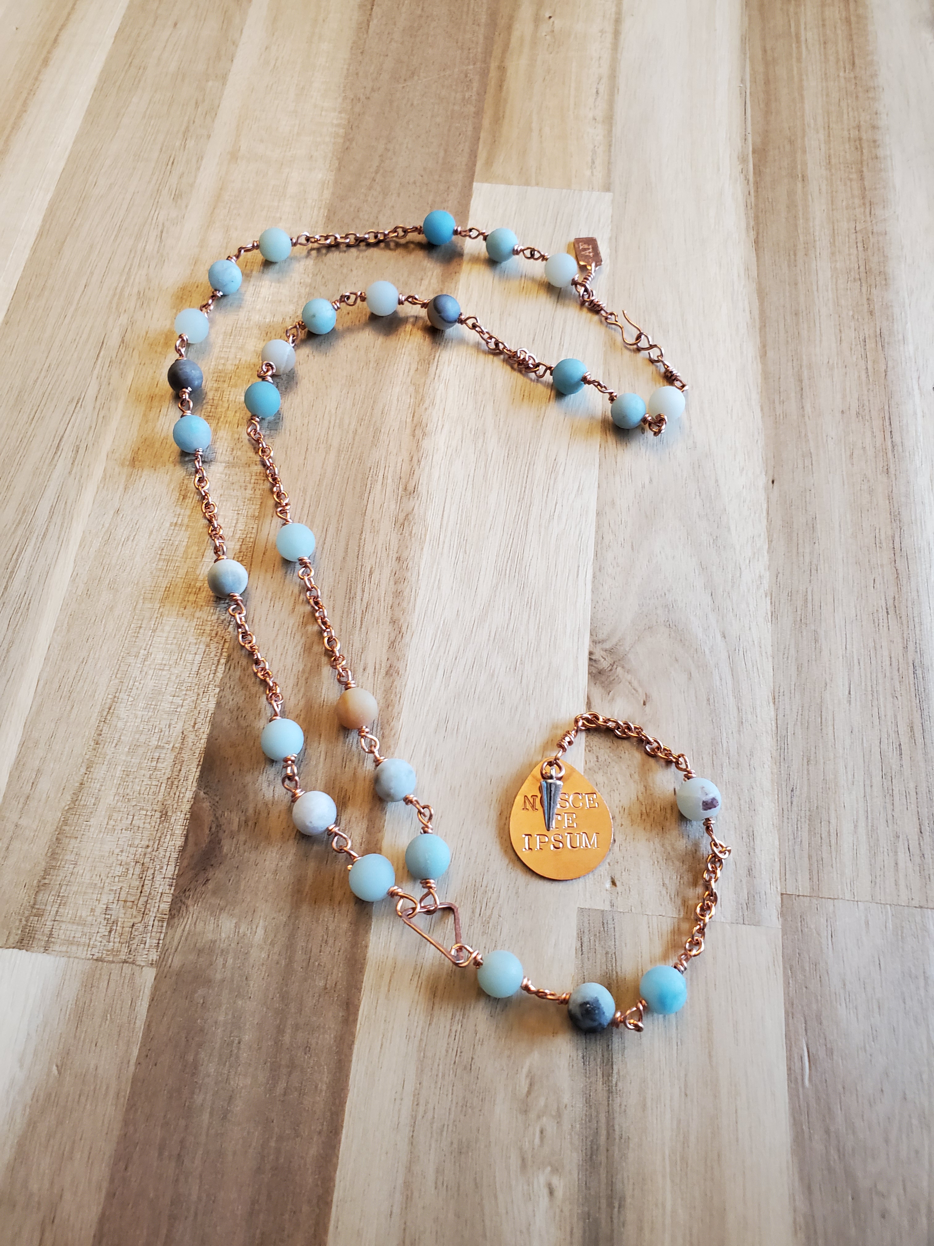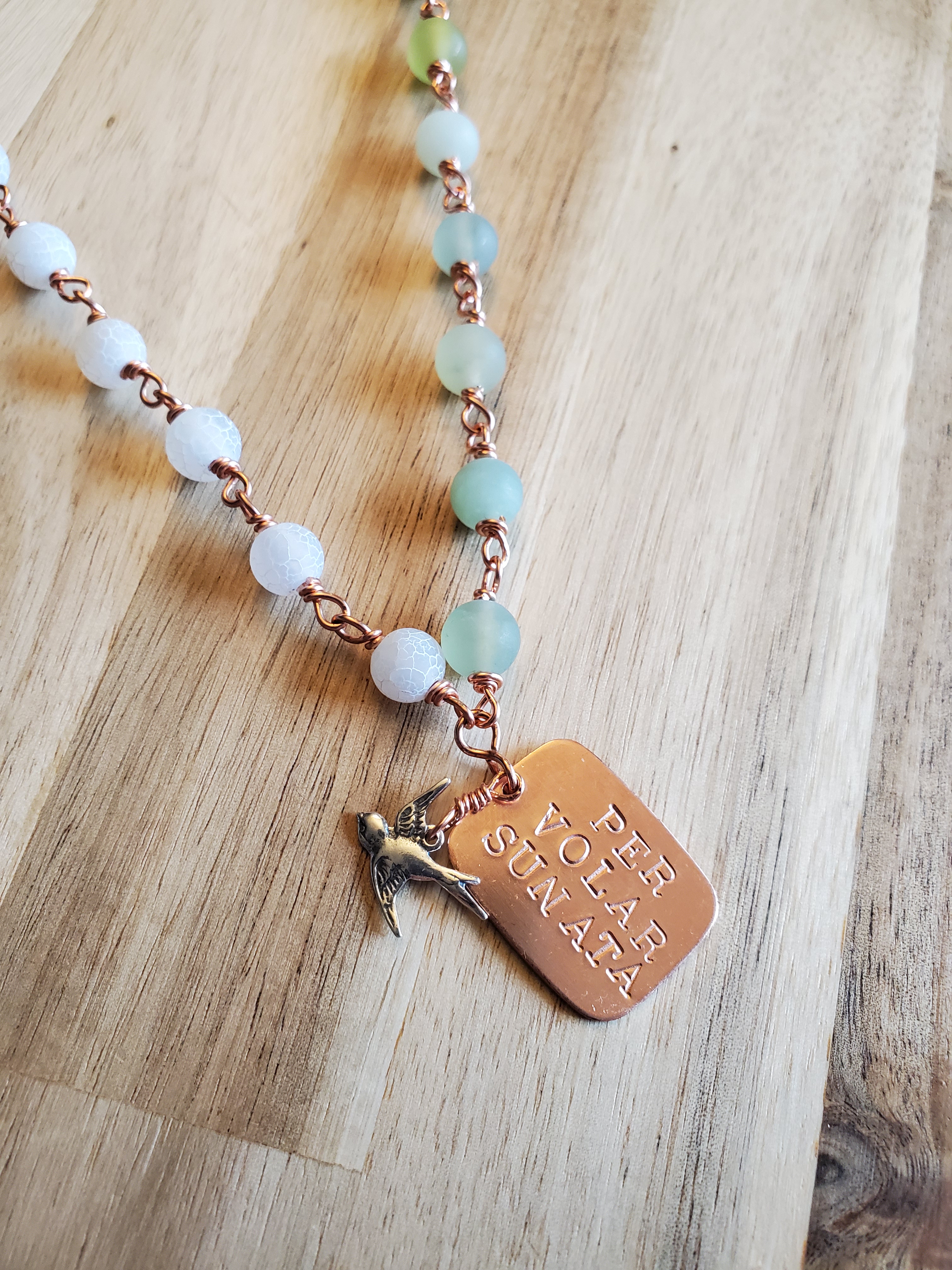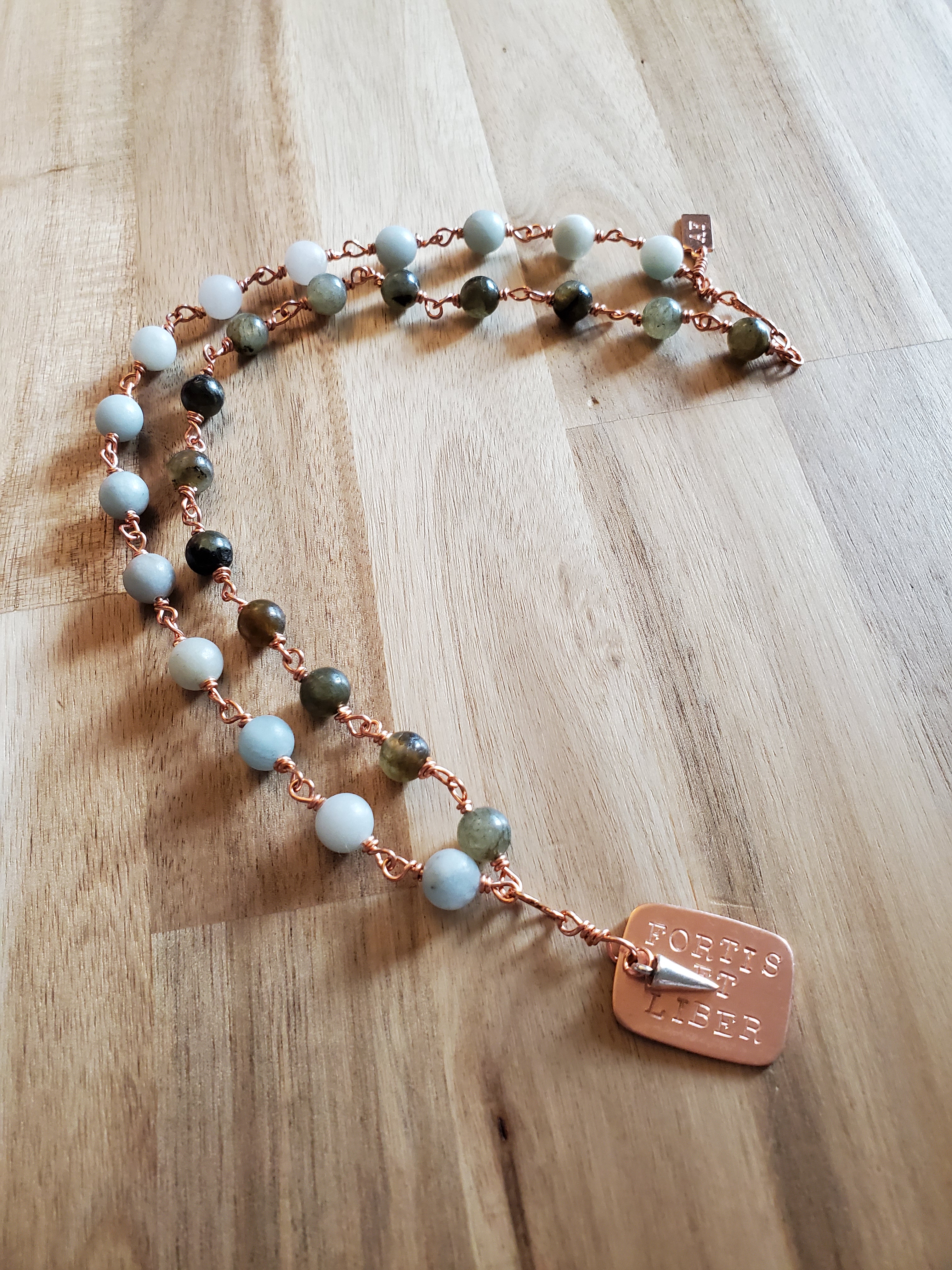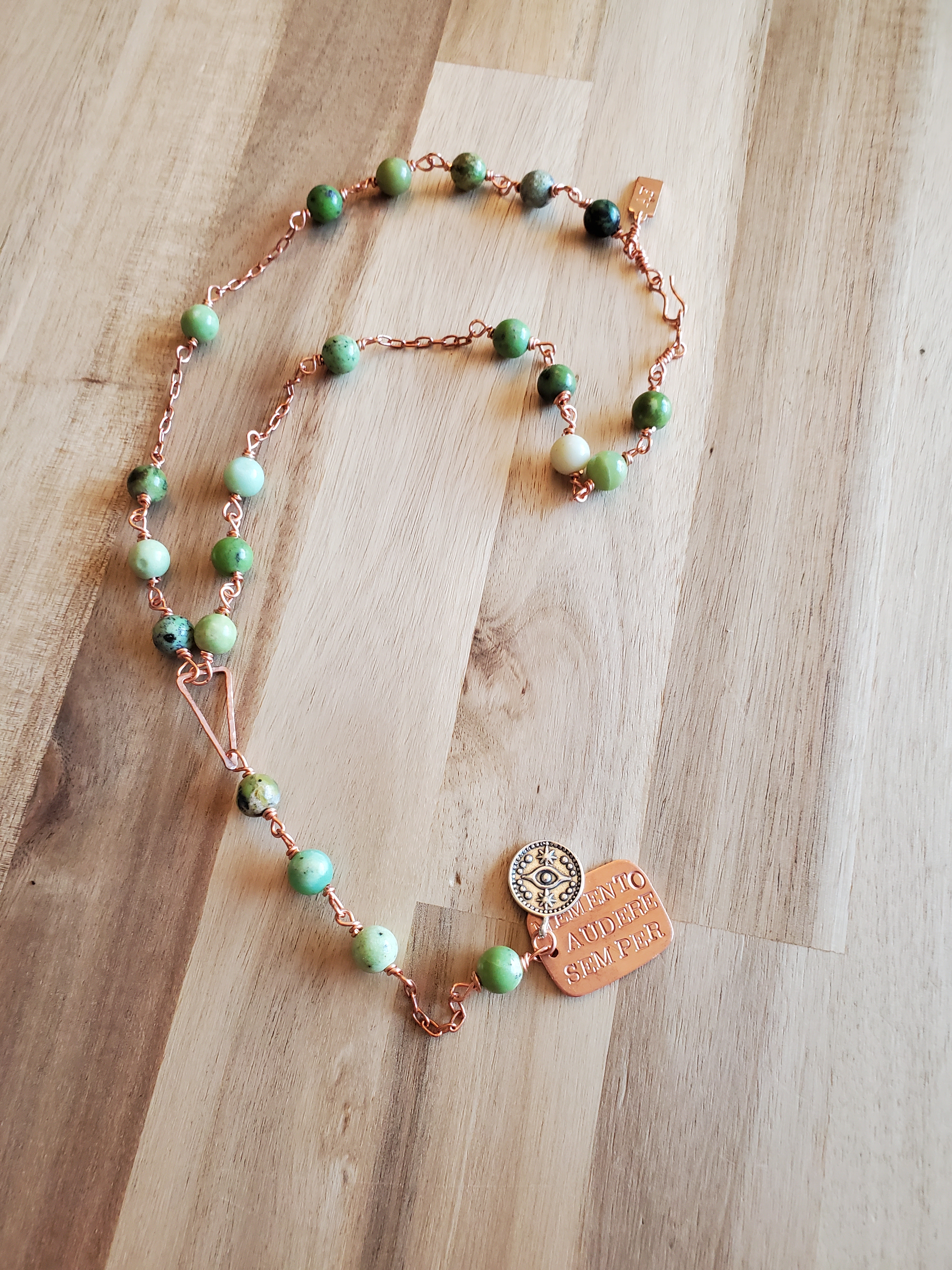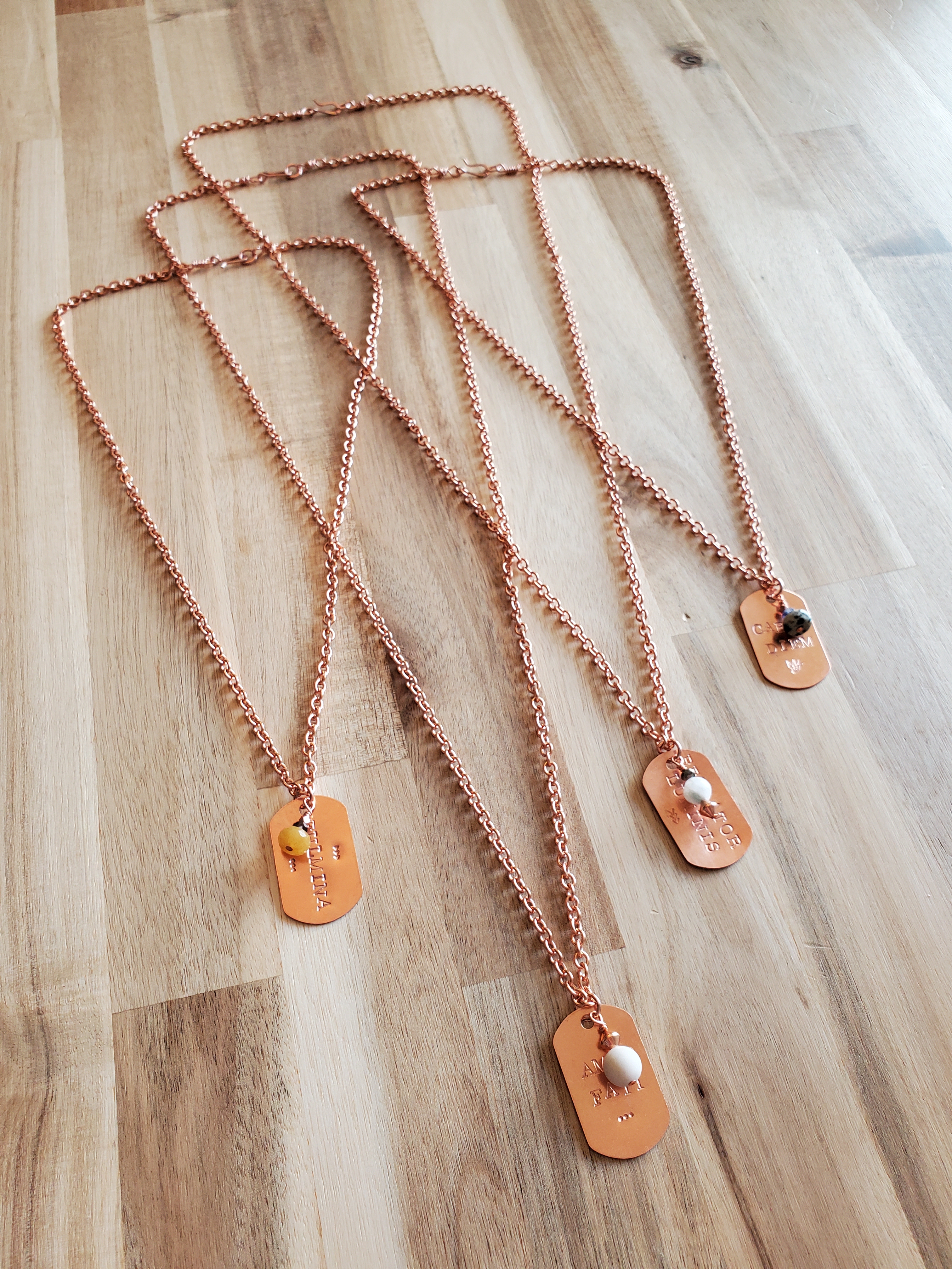 Handmade copper and sterling silver jewelry made with semi-precious gemstones and featuring empowering Latin phrases.