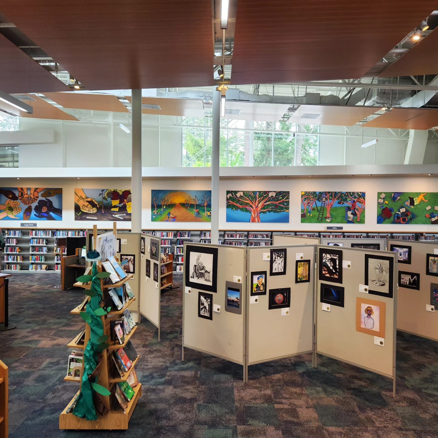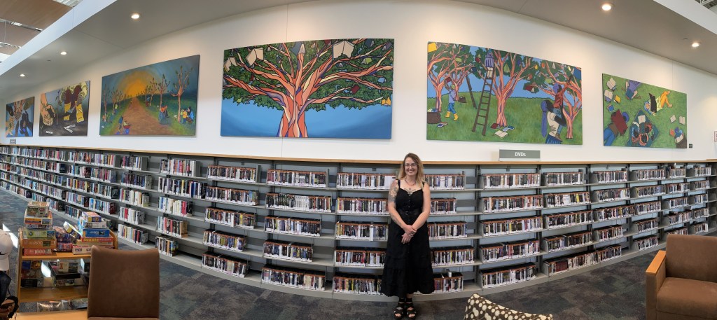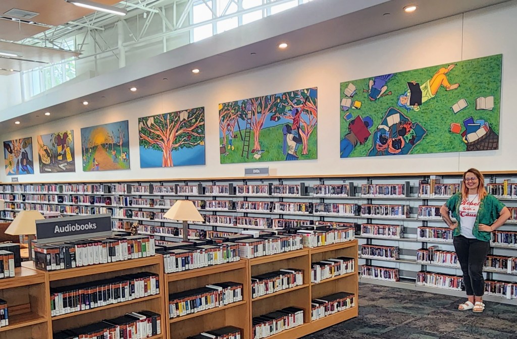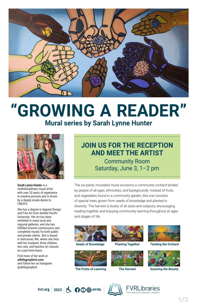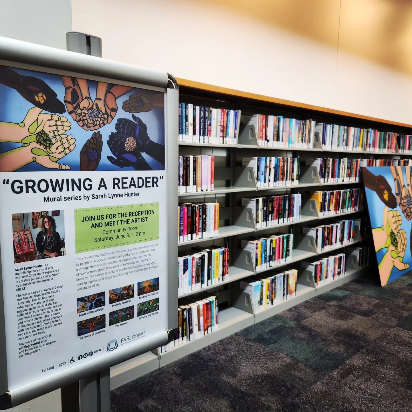 This six-panel mural is part of the permanent public art collection of Fort Vancouver Regional Libraries, and is installed at Cascade Park Community Library in Vancouver, WA. It was commissioned from a public Call To Artists and was completed and installed in May 2023.