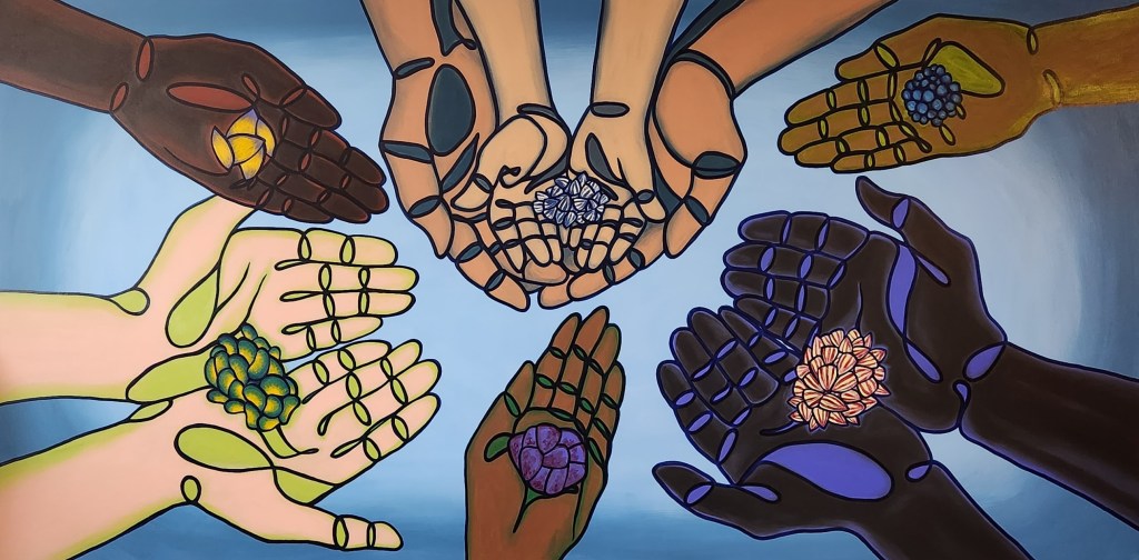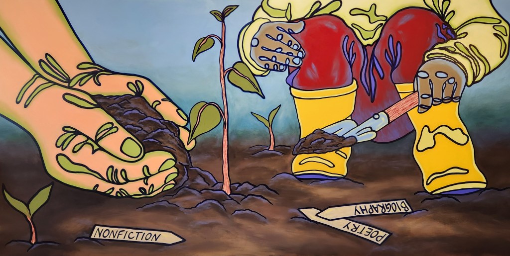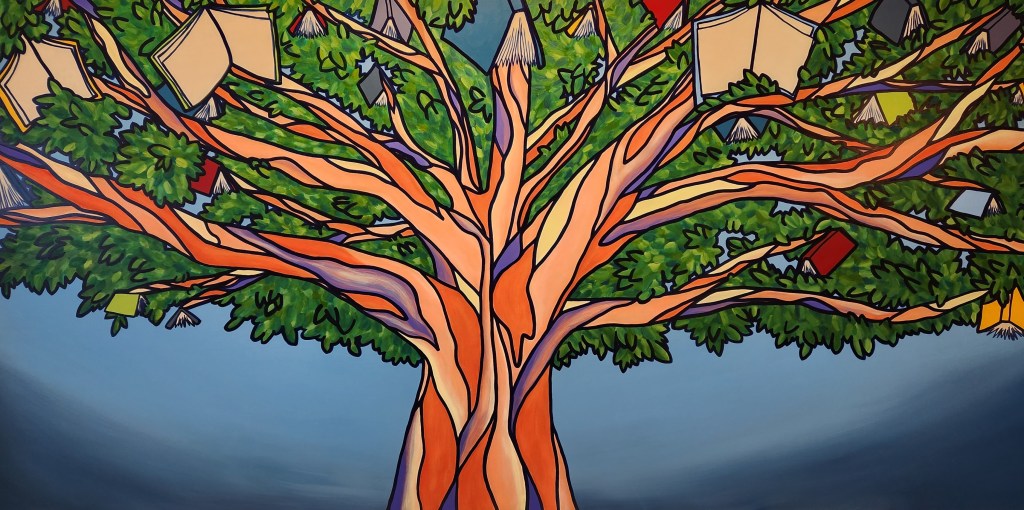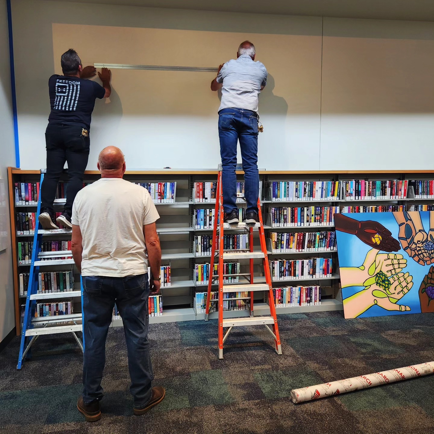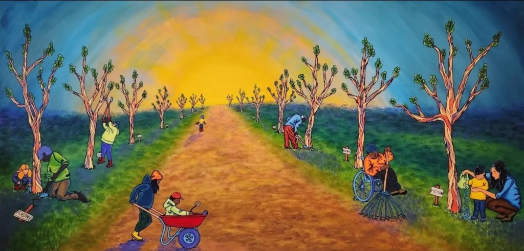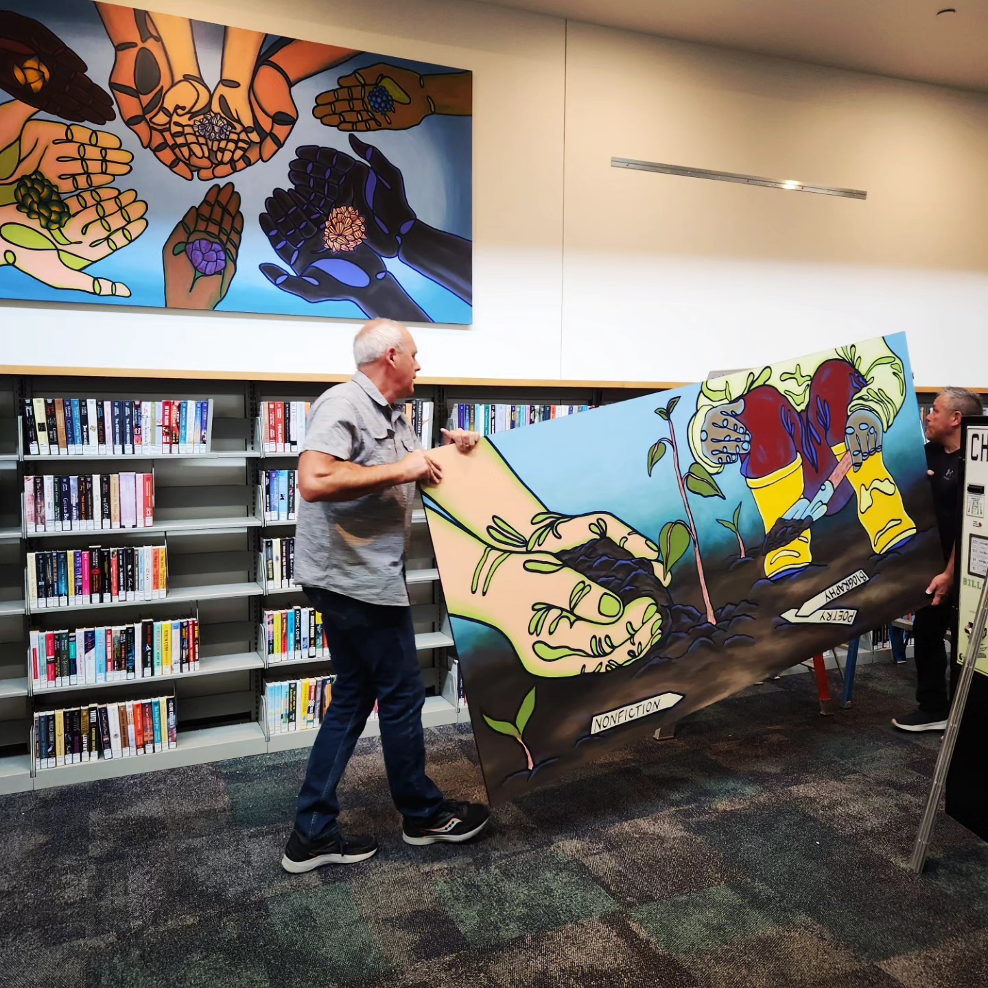 This “moveable” mural envisions a community orchard tended by people of all ages, ethnicities, and backgrounds. However, instead of the usual fruits and vegetables normally found in a community garden, this one is comprised of special trees grown from seeds of knowledge and planted in diversity. The harvest is books of all sizes and subjects, encouraging reading together and enjoying learning in community throughout all ages and stages of life.