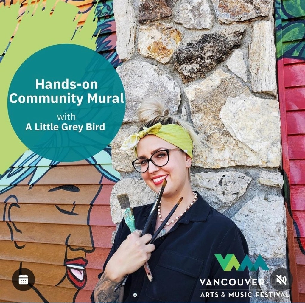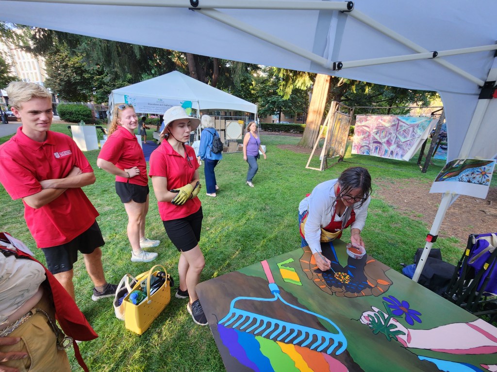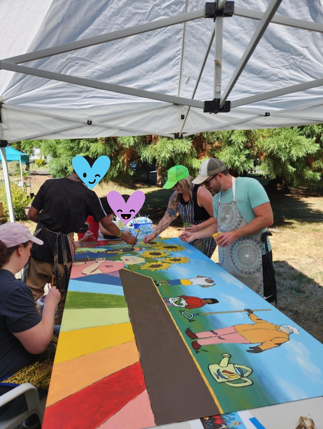 Designed and led by Sarah Lynne Hunter, this collaborative mural panel was created in community during the 2024 Vancouver Arts & Music Festival at Esther Short Park in Vancouver, WA. The artist completed final touch-ups and sealant in her studio and the mural panel will be installed in the City of Vancouver [final location TBD].