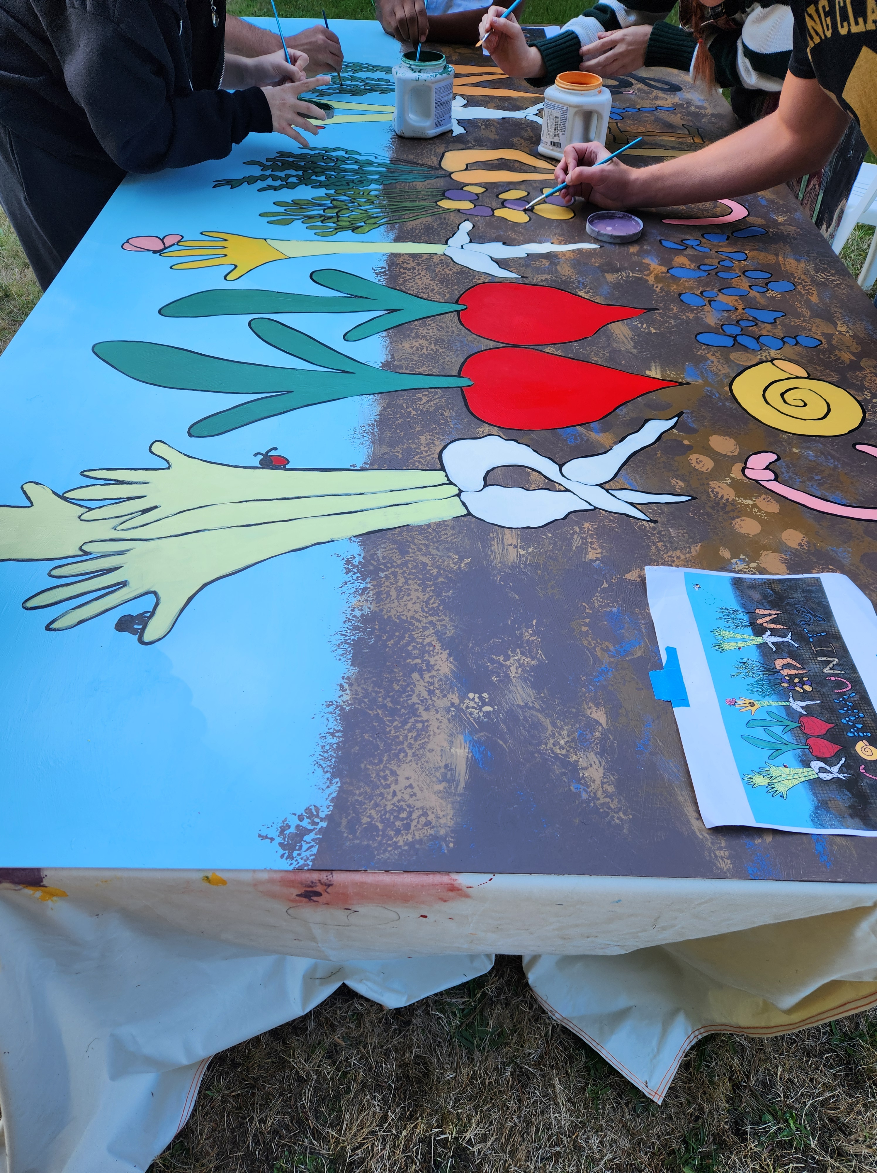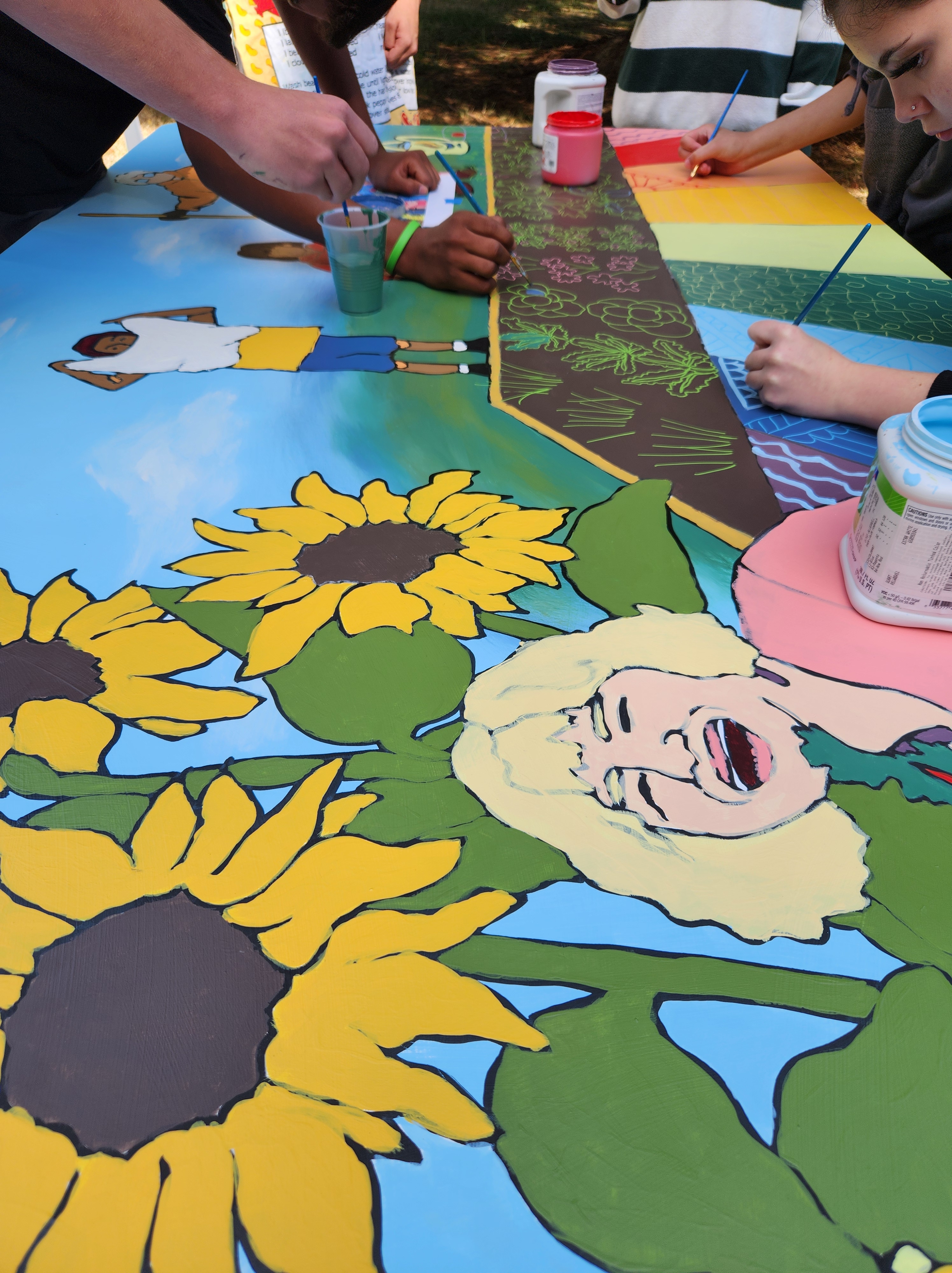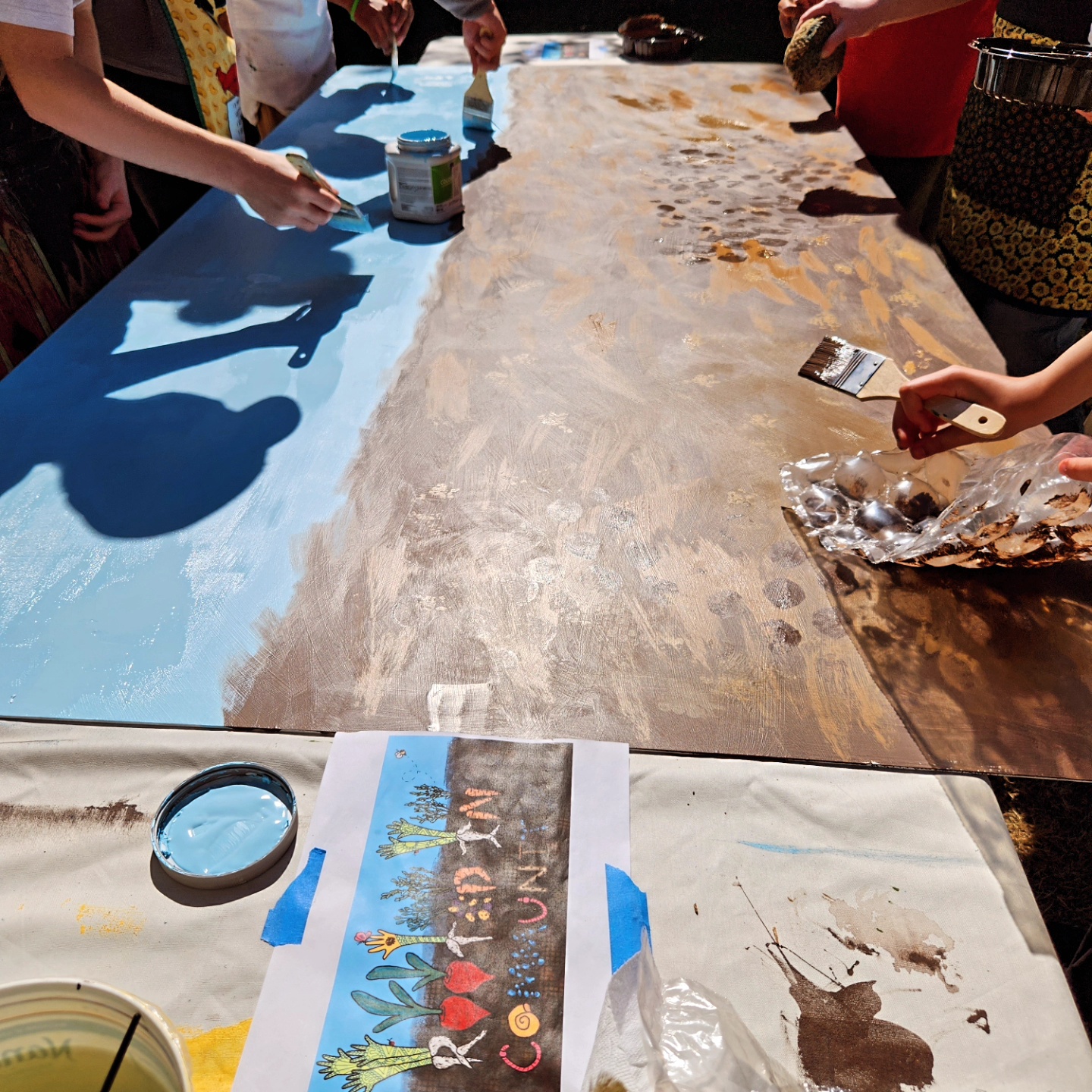Designed and led by Sarah Lynne Hunter, this collaborative mural panel was created in community during the 2024 Vancouver Arts & Music Festival at Esther Short Park in Vancouver, WA. The artist completed final touch-ups and sealant in her studio and the mural panel will be installed in the City of Vancouver [final location TBD].
