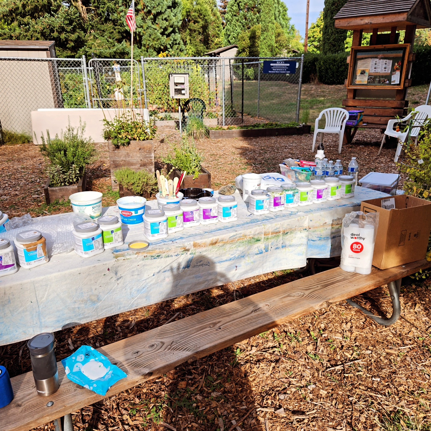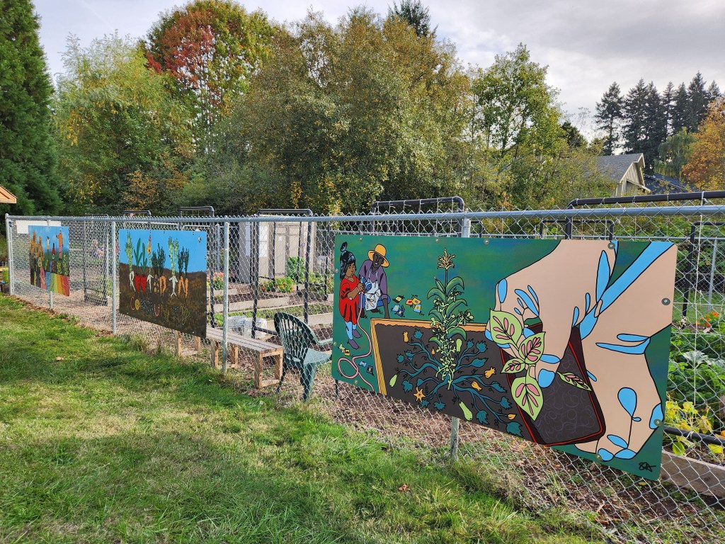 Funded in large part by an Arts, Culture, and Heritage Grant from the City of Vancouver, this collaborative mural was created in conjunction with the Unitarian Universalist Church of Vancouver, Maplewood Moseley Community Garden, and the Restorative Community Service program at Clark County Juvenile Court. The artwork for these panels was developed through a Community Listening Session at UUCV, as well as through a series of three hands-on workshop sessions with RCS youth. The artwork was painted by youth and RCS volunteers over a series of three full painting days led by the Artist. The Artist completed finishing touches, final linework and sealant in her studio, and the panels were then installed along the north fence at the Maplewood Moseley Community Garden to beautify and uplift this important community space.