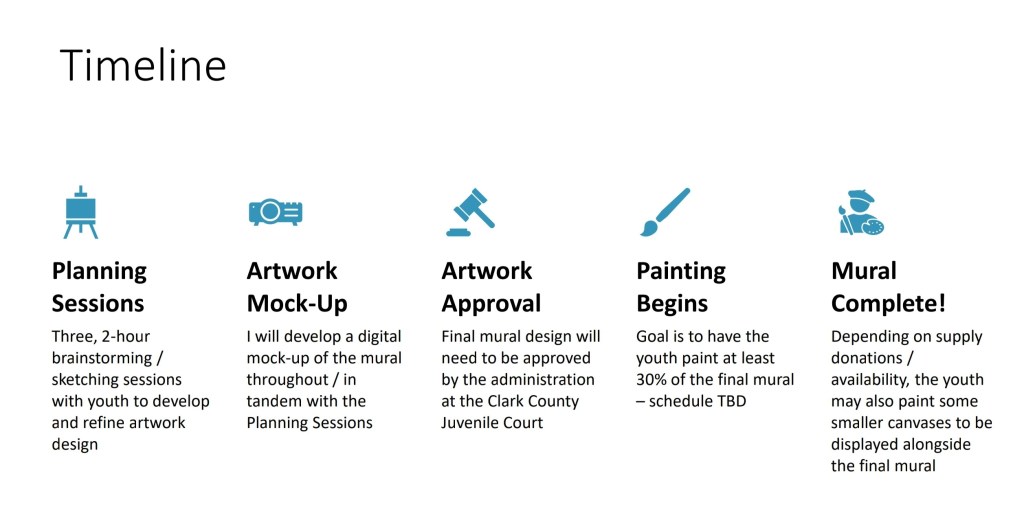 The resulting mural will be a lasting, tangible, positive accomplishment that they can be proud of, and the teamwork and artistic skills gleaned from the entire process will hopefully have a therapeutic impact on their lives moving forward.
