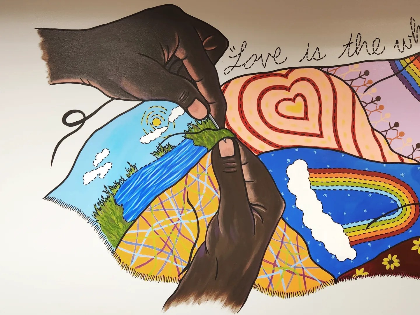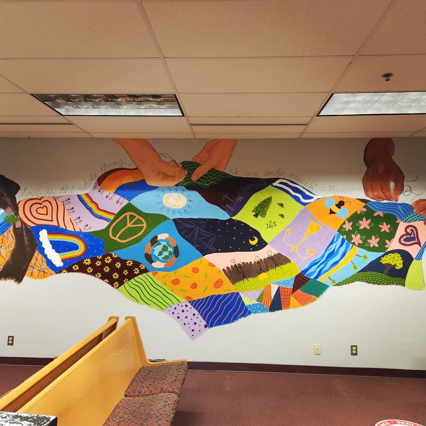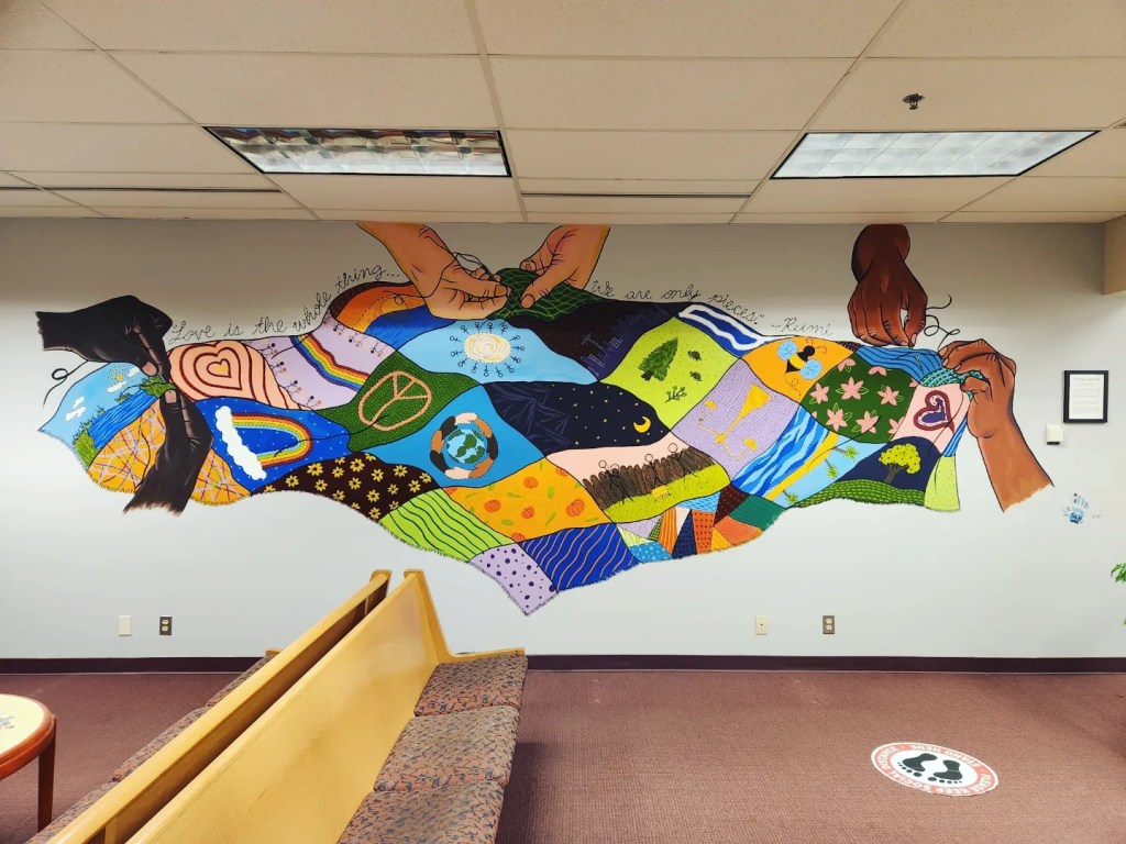 This famous quote, “stitched” above a patchwork quilt sewn by diverse hands working together in community, speaks toward the love and inclusion that this artwork represents. The tradition of quilting has a rich cultural history—quilts were often made in community by many different hands, they were used to tell stories or communicate messages, they were often given as cherished gifts to mark momentous occasions, and they were created with love and care out of whatever fabrics were readily available—including using scraps and mending with patches to restore wear and tear. In this mural, each of the different quilt block designs was developed collaboratively and based upon the themes of inclusion, community, diversity, equity, and restoration. Hands of different nationalities work together in unity to piece the diverse and colorful quilt blocks together; each one contributing with the best of their ability to unify and beautify the whole.