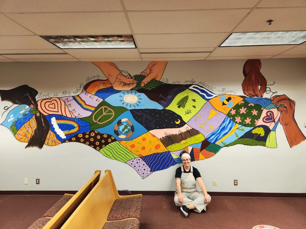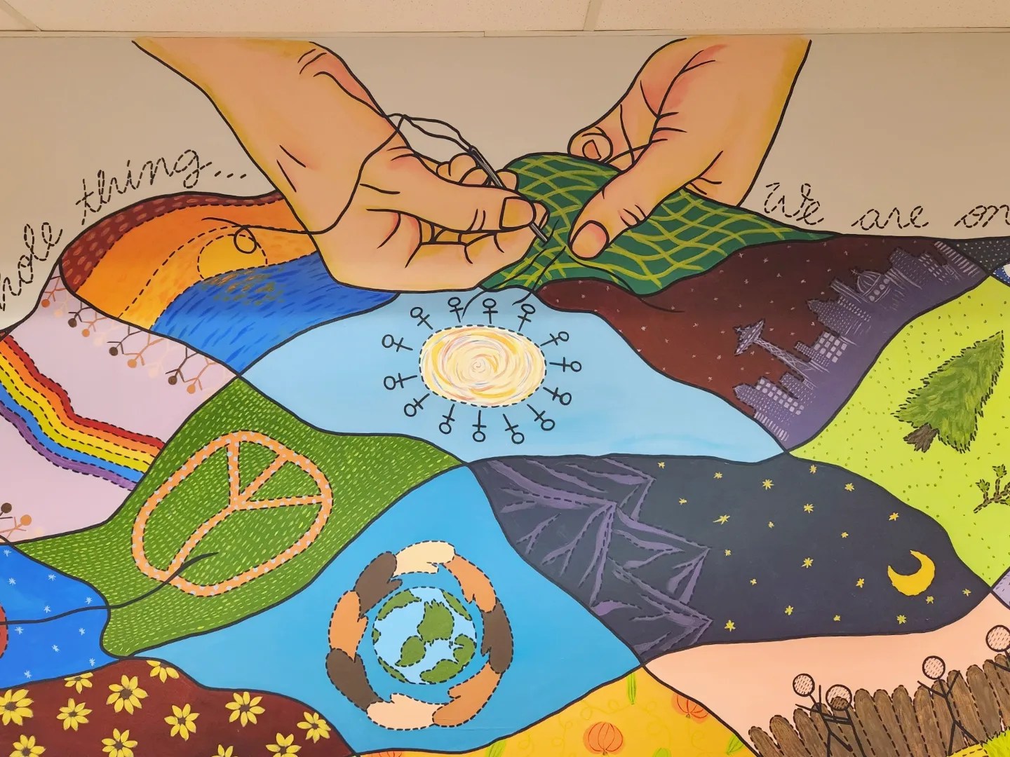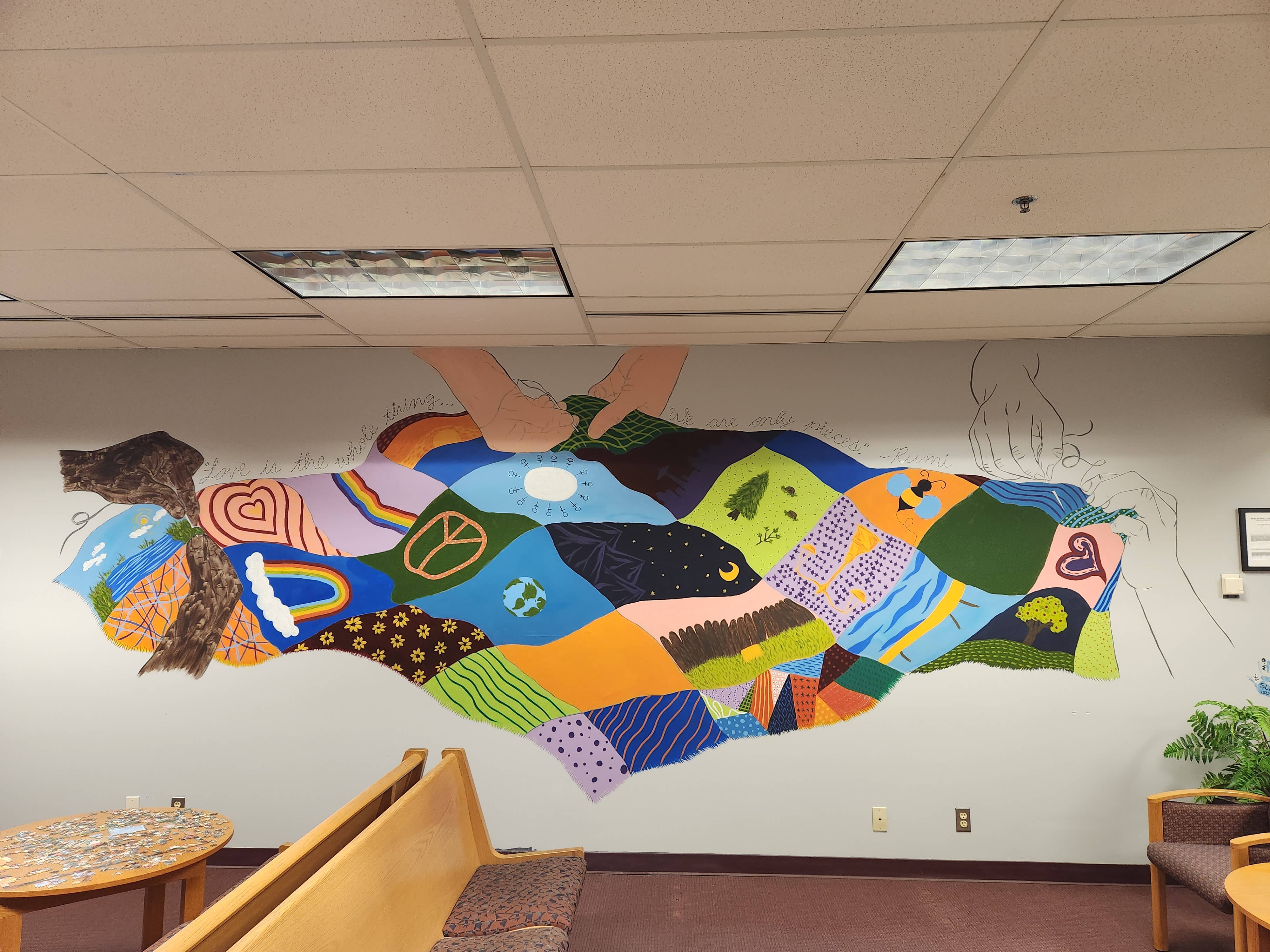 This famous quote, “stitched” above a patchwork quilt sewn by diverse hands working together in community, speaks toward the love and inclusion that this artwork represents. The tradition of quilting has a rich cultural history—quilts were often made in community by many different hands, they were used to tell stories or communicate messages, they were often given as cherished gifts to mark momentous occasions, and they were created with love and care out of whatever fabrics were readily available—including using scraps and mending with patches to restore wear and tear. In this mural, each of the different quilt block designs was developed collaboratively and based upon the themes of inclusion, community, diversity, equity, and restoration. Hands of different nationalities work together in unity to piece the diverse and colorful quilt blocks together; each one contributing with the best of their ability to unify and beautify the whole.